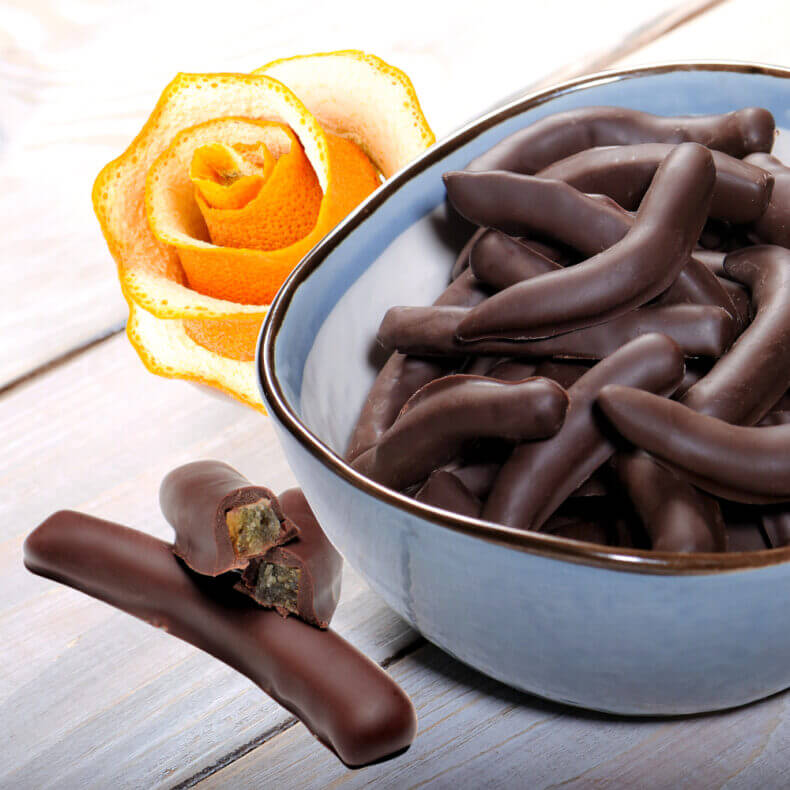 A klasszikus narancs. A kandírozott gyümölcsök közül az egyik legismertebb és legnépszerűbb a csokoládéba mártott kandírozott narancshéj. Vigyázat, minőségi étcsokoládéval párosítva veszélyesen eteti magát, csábítóan finom!